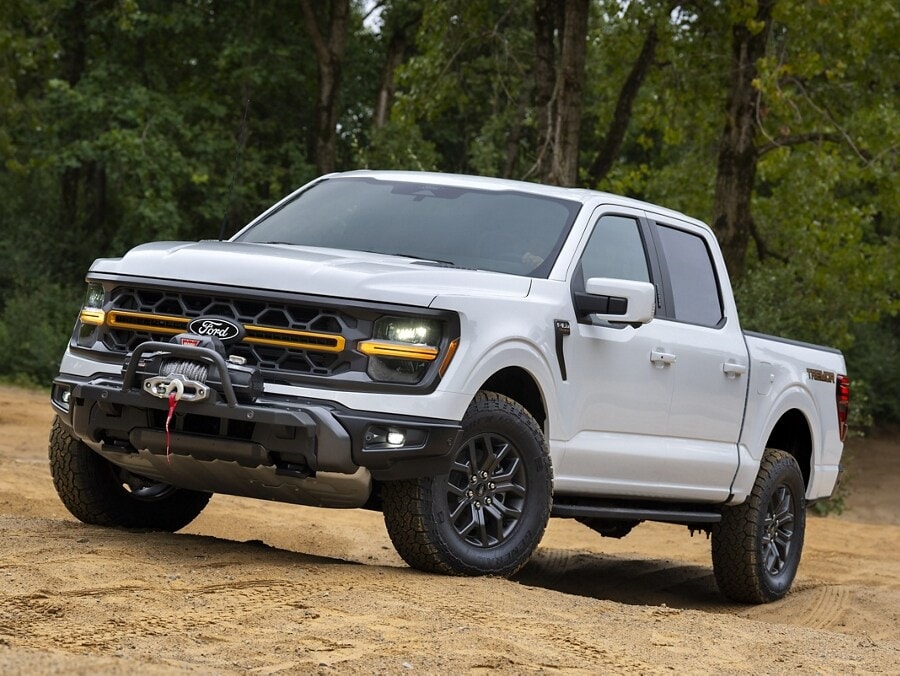The F-150® Tremor® pickup sports a rugged off-road-tuned suspension, large breakover and departure angles and steel skid plates that instill confidence while traversing rocky trails. Meaty all-terrain tires and selectable drive modes help provide a firm grip on unforgiving territory.‡